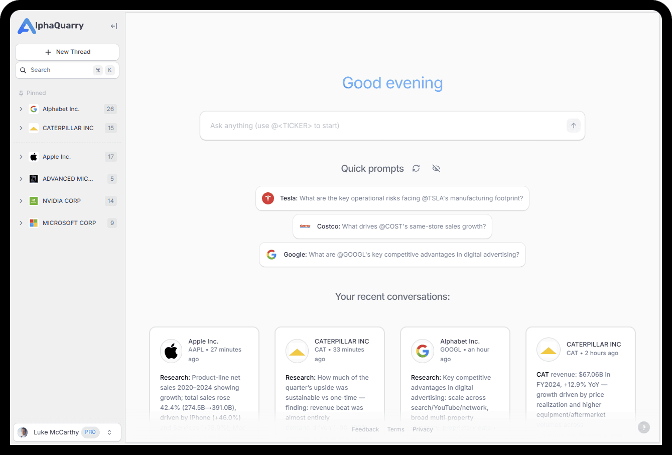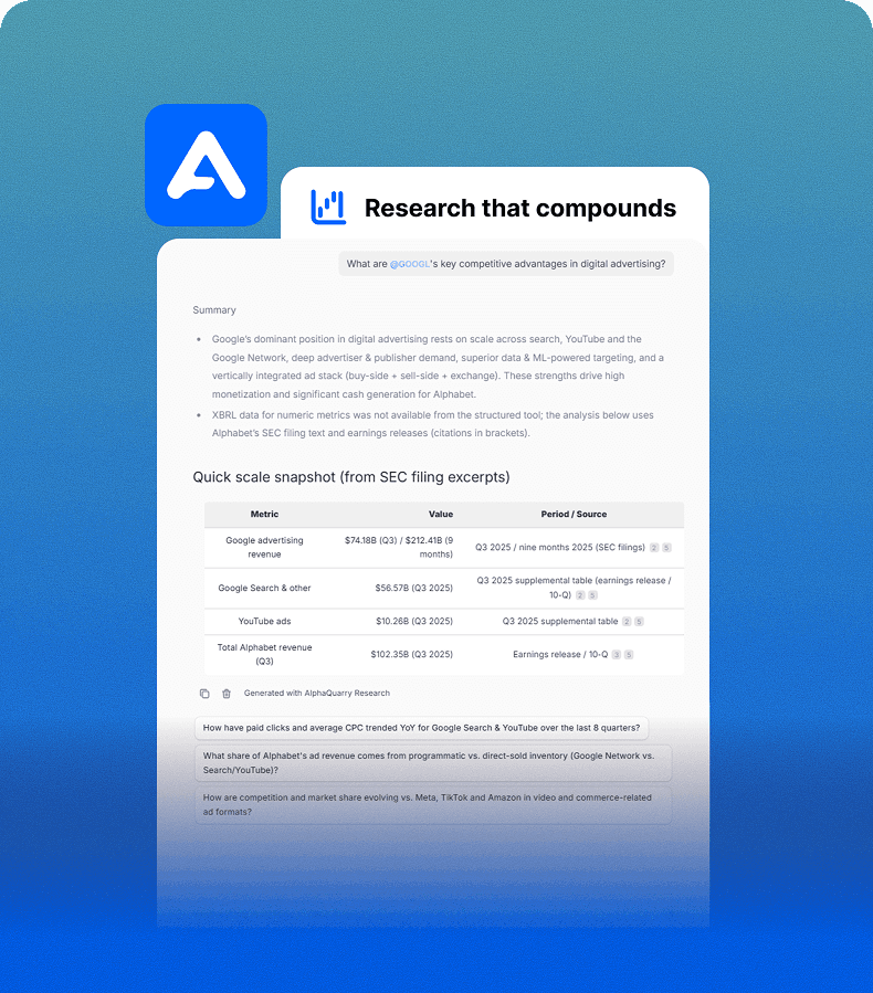 AlphaQuarry is a purpose-built AI research interface trained on decades of SEC filings and financial data. Answer any question about US stocks with full context.
